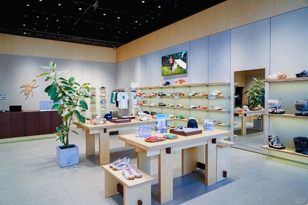 橱窗与店内结合露营、城市轻户外、休闲通勤等场景,搭配户外绿植软装,不止是卖鞋,更向消费者传递“TSUBO鞋履适配的生活方式”。