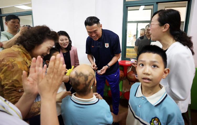 活动开始,在学校领导的引导下,队员们开始参观。一楼大厅内,师生们带来了民乐合奏,欢迎队员们的到来。随后,队员们与孩子们展开了互动。在一楼体康室,队员们与孩子们一起进行了运球射门活动,与孩子们共同体验足球的快乐。在二楼美术室,大家驻足观赏沙画创作过程及孤独症小画家作品展,感受特殊儿童笔下的斑斓世界。孩子们手捧精心绘制的球员肖像画送给队员们,画作上五彩斑斓的笔触间,满是对队员们的崇拜。刘彬彬表示:“孩子们每一幅画作都饱含对生活的热爱,这幅画真让人震撼。”在音乐室中,队员们与孩子们一同沉浸于非洲鼓的韵律之美。张弛表示:“没想到孩子们打节奏打得这么好,有些节拍对他们来说挺难的,但他们掌握得很出色,打鼓时节奏特别齐,听起来特别棒!”