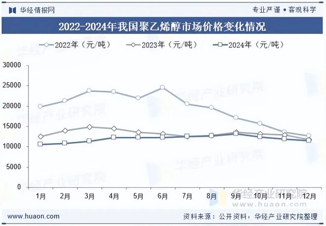 2022-2024年,我国聚乙烯醇的市场平均价格呈现不断下降发展态势,其中2022年市场平均价格为19467元/吨(以1799牌号为例),2023年为13250元/吨,同比下降约31.94%。2024年为11942元/吨,同比下降9.87%。