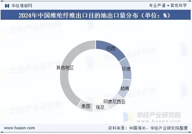 从我国维纶纤维出口目的地出口量分布来看,2024年巴西、印度、越南、印度尼西亚、埃及与泰国是我国维纶纤维出口量排前六国家,出口量合计占比58.6%,其他地区出口量合计占比41.4%。